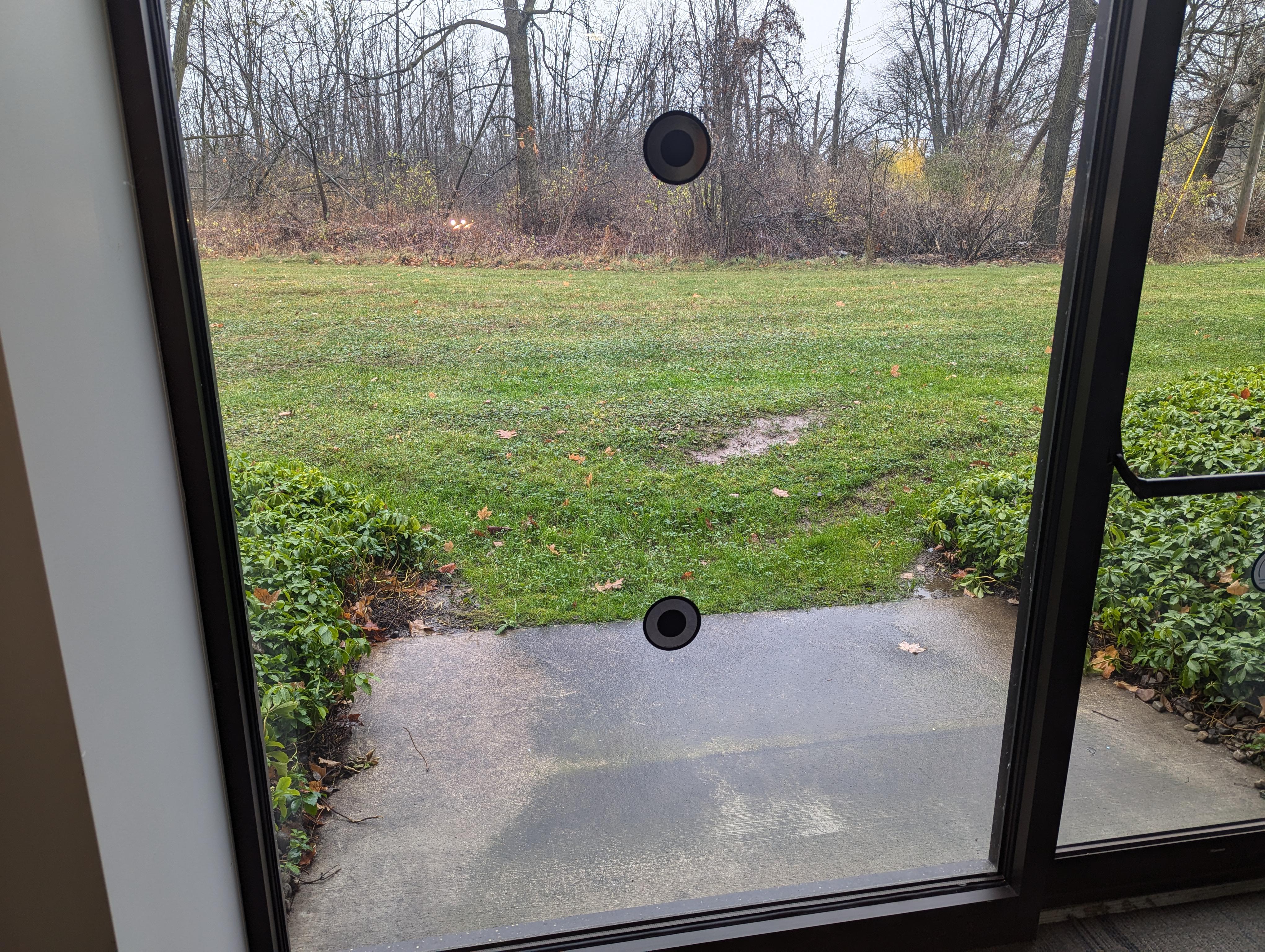 Sort of just a fun fact here. My job facility is located in the center of a thriving wildlife community which consists of critter-level creatures like gophers and groundhogs, birds of all kinds, deer, and even wild turkeys. The reflective dots pictured are affixed to the large glass windows around the facility in hopes of (and presumed actual effectiveness) letting them all know that hey!, this here part of the universe is made of glass. No charging, flying, or trotting on through.