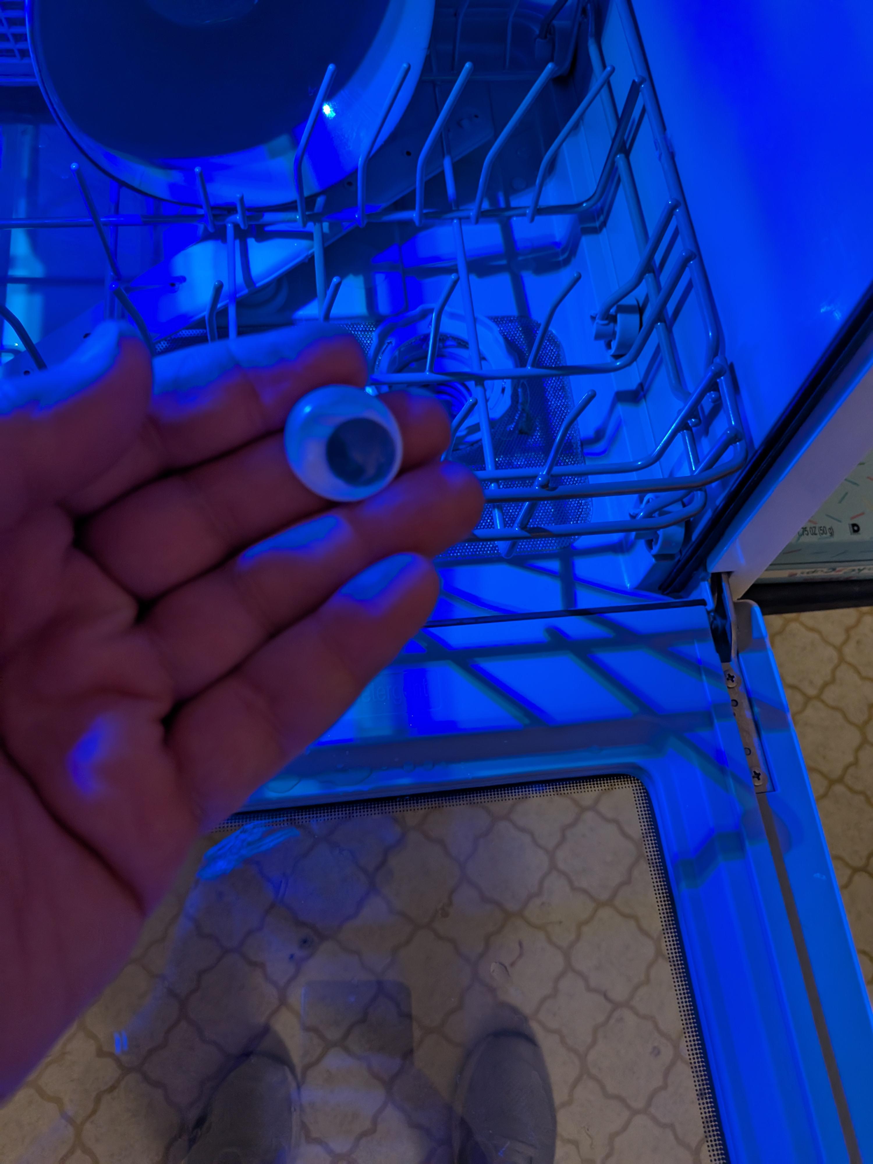 It's been a handicap going day to day with a missing eye for months. At last, it turned up in the well of my dishwasher.